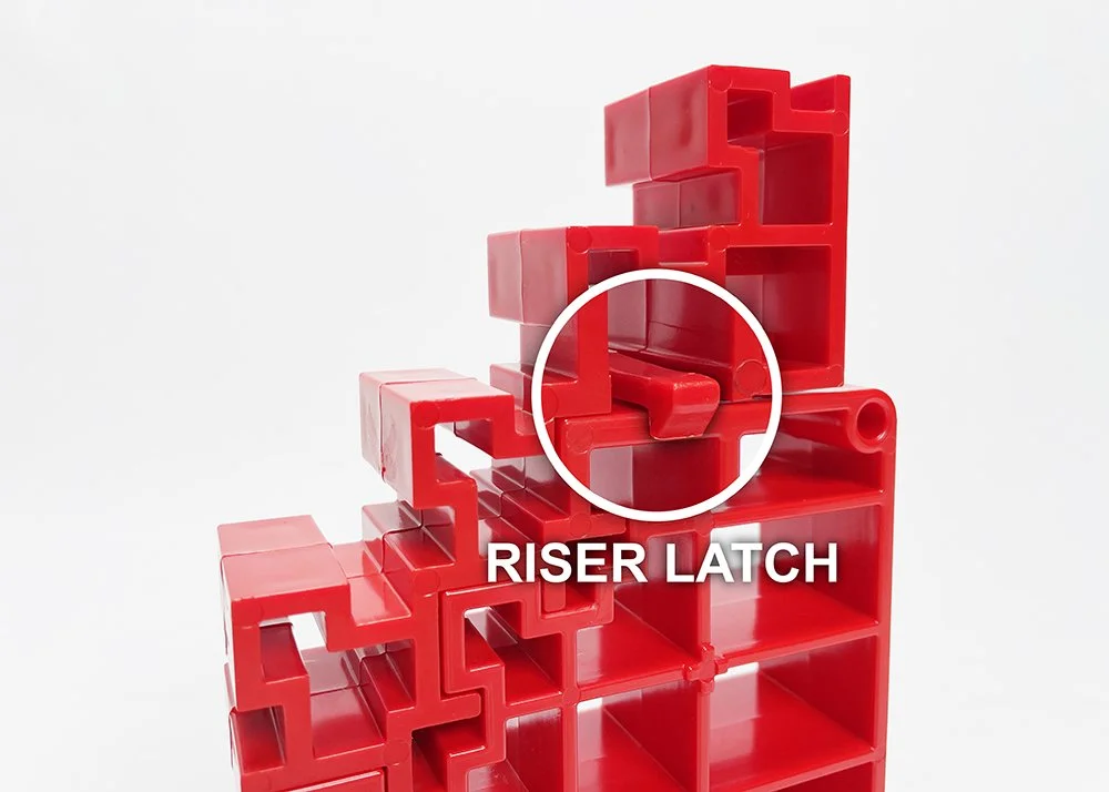 The Riser has a small latch on one side and a stop on the other. To attach the Stedi Step® and Riser, orient them so the flat sides align, and slide the Riser into the support notches of the Stedi Step® latch side first. To remove the Riser, lift the latch and slide apart. Flip the Stedi Step® and reattach the Riser to adjust the support points up or down by one half inch.